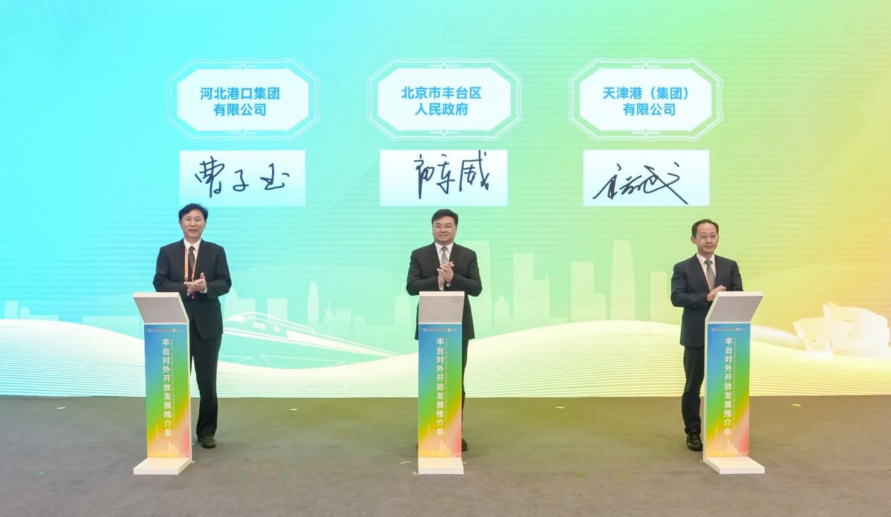 9月15日,2024年中國國際服務貿易交易會期間,由北京市商務局、北京市豐臺區人民政府主辦,以“開放創新服務 共繪豐采未來”為主題的豐臺對外開放發展推介會在國家會議中心舉辦。會上,天津港集團與北京市豐臺區人民政府、河北港口集團簽署戰略合作框架協議,全面貫徹落實黨的二十屆三中全會精神,構建跨行政區合作發展新機制,推動京津冀協同發展和津冀港口高質量發展。
